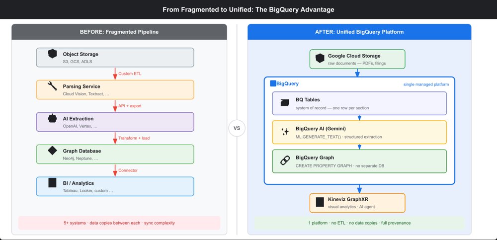 Mais de 80% dos dados corporativos residem em formatos não estruturados — PDFs, e-mails, relatórios regulatórios e atas. Embora contenham informações vitais para o negócio, o acesso e a correlação desses dados em escala permanecem um gargalo operacional. A combinação do BigQuery Graph com o Kineviz GraphXR oferece uma mudança de paradigma: um fluxo de trabalho unificado que permite aos tomadores de decisão não apenas visualizar, mas interagir com relações complexas ocultas em documentos de larga escala.